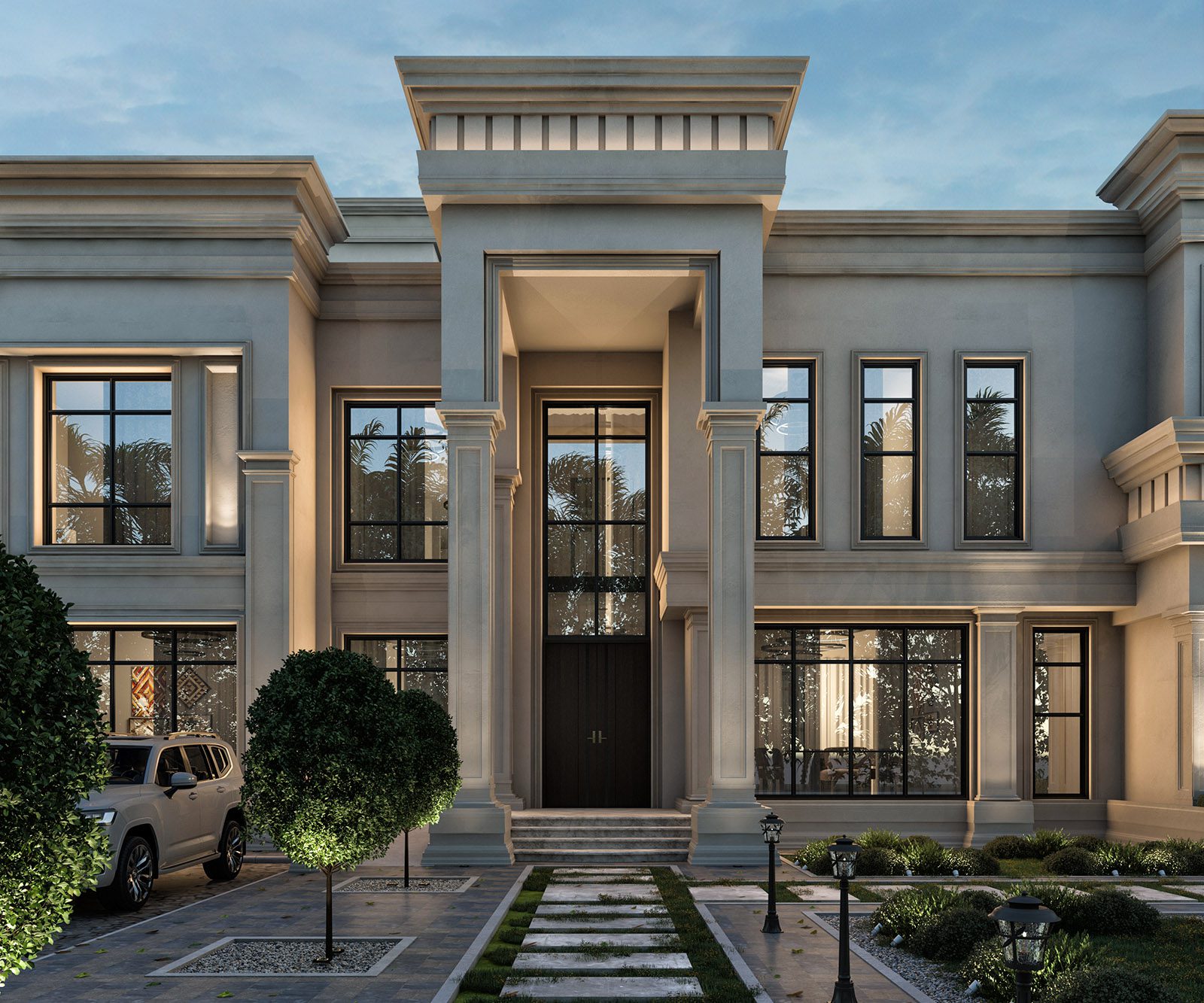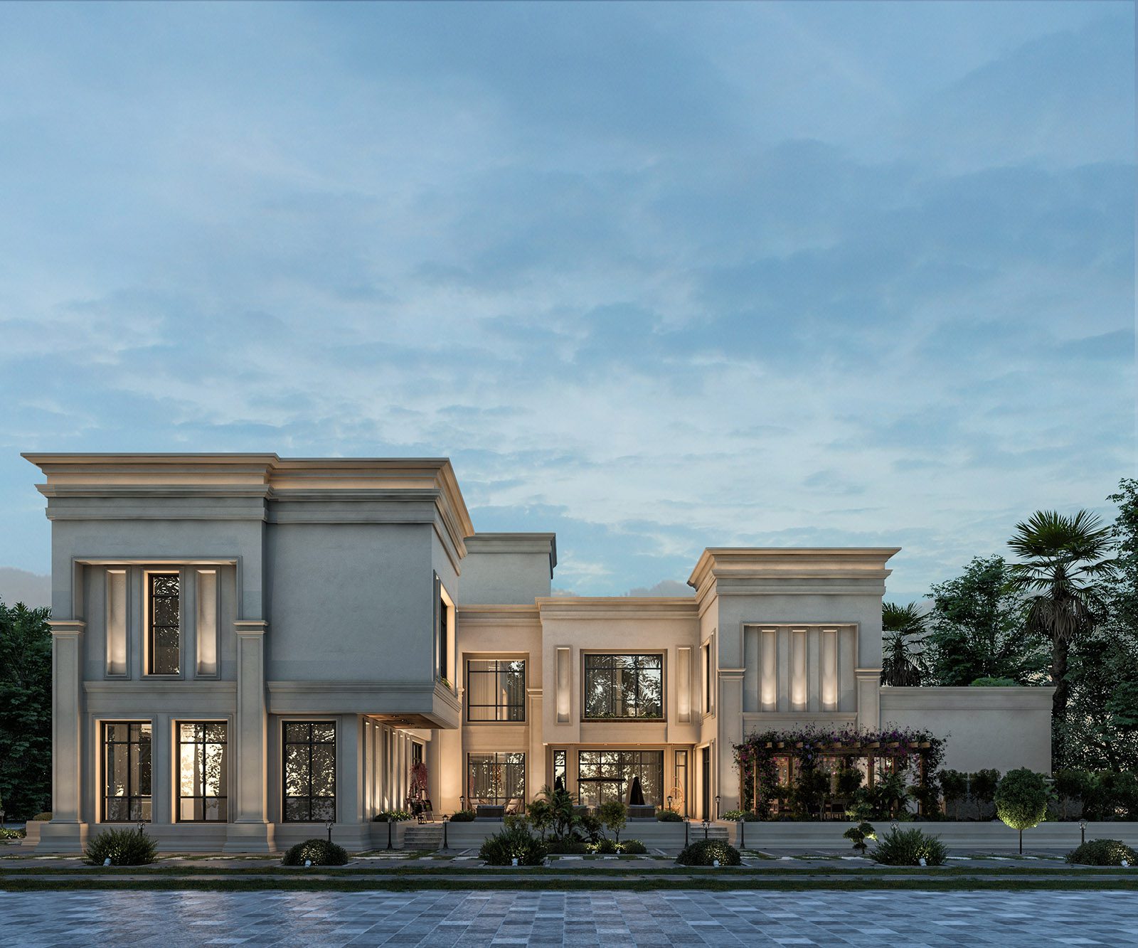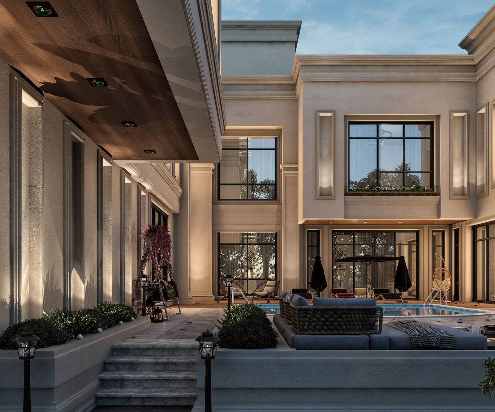 A villa designed around luxury and openness. Large glazed panels allow natural light to flood double-height spaces, while the integration of outdoor terraces and a private pool brings resort-like living into everyday life. Classical proportions meet modern detailing for a stately yet welcoming residence.